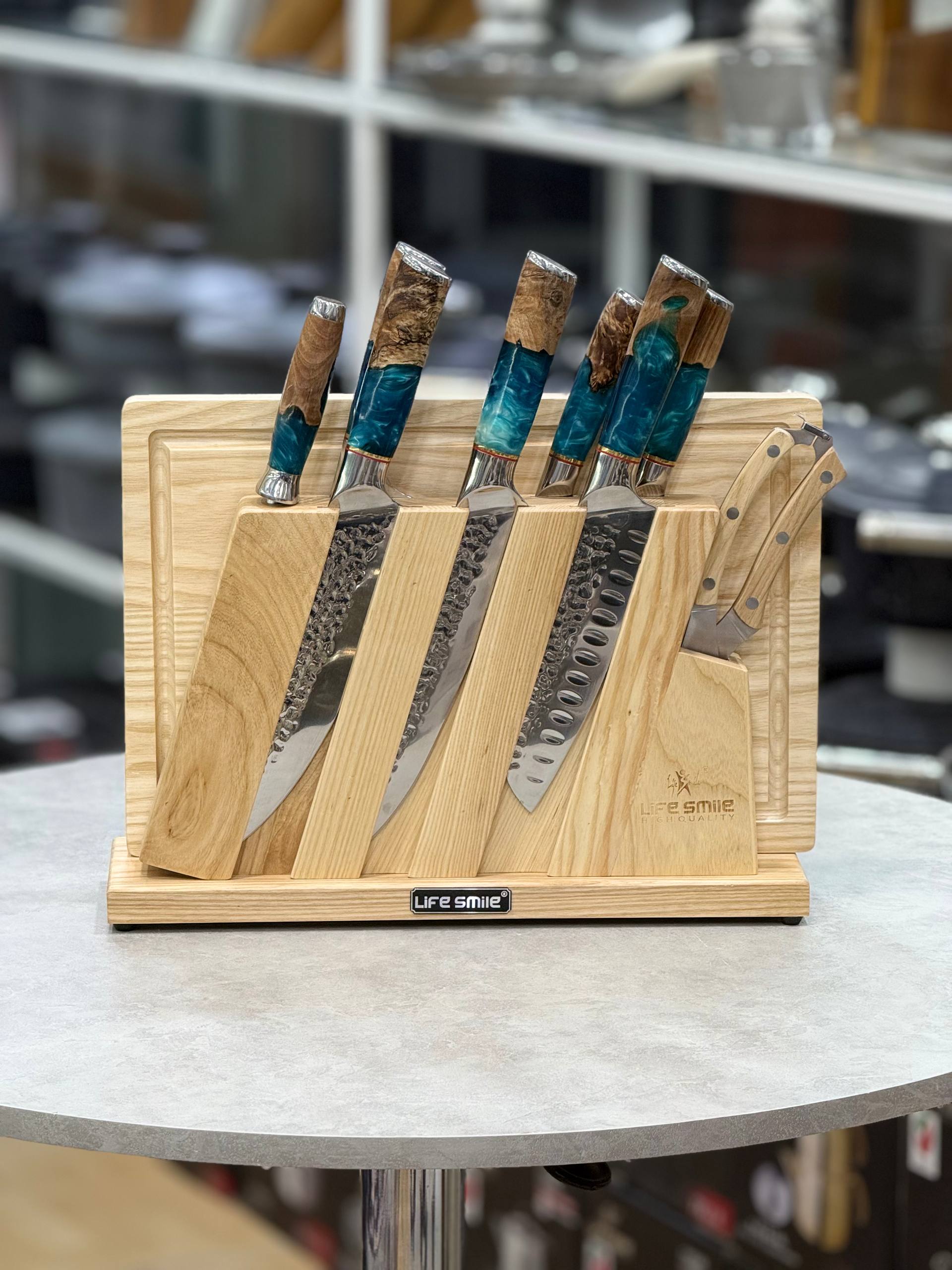 شامل :ساطور، چاقوی سرآشپز، چاقوی سانتوکو، چاقوی برش، چاقوی پوست کندن، چاقوی عمومی، قیچی، ابزار تیز کننده، پایه نگهدارنده، تخته خردکن